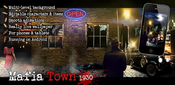 Mafia town 1930 is an interactive wallpaper located on several screens in climates MAFIA from the years 1930. The distinctive atmosphere of mafia, dark, dead, courtesans and all this detective shows great live wallpaper Mafia Town 1930