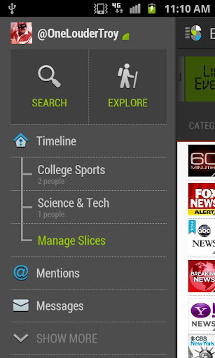 ? Finding Follows � Slices is the only Twitter app with Explore. Explore is a directory of all of Twitter. With 21 browsable, searchable categories, finding people and lists to follow is astonishingly easy and fun.