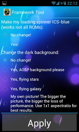 Now it is your turn! Take control of your phone and make it fit to your mood and style, use hot features as the possibility to use your own backgrounds (in the Settings application as an example) for the system (3.0+), with just a few taps, and no computer required!